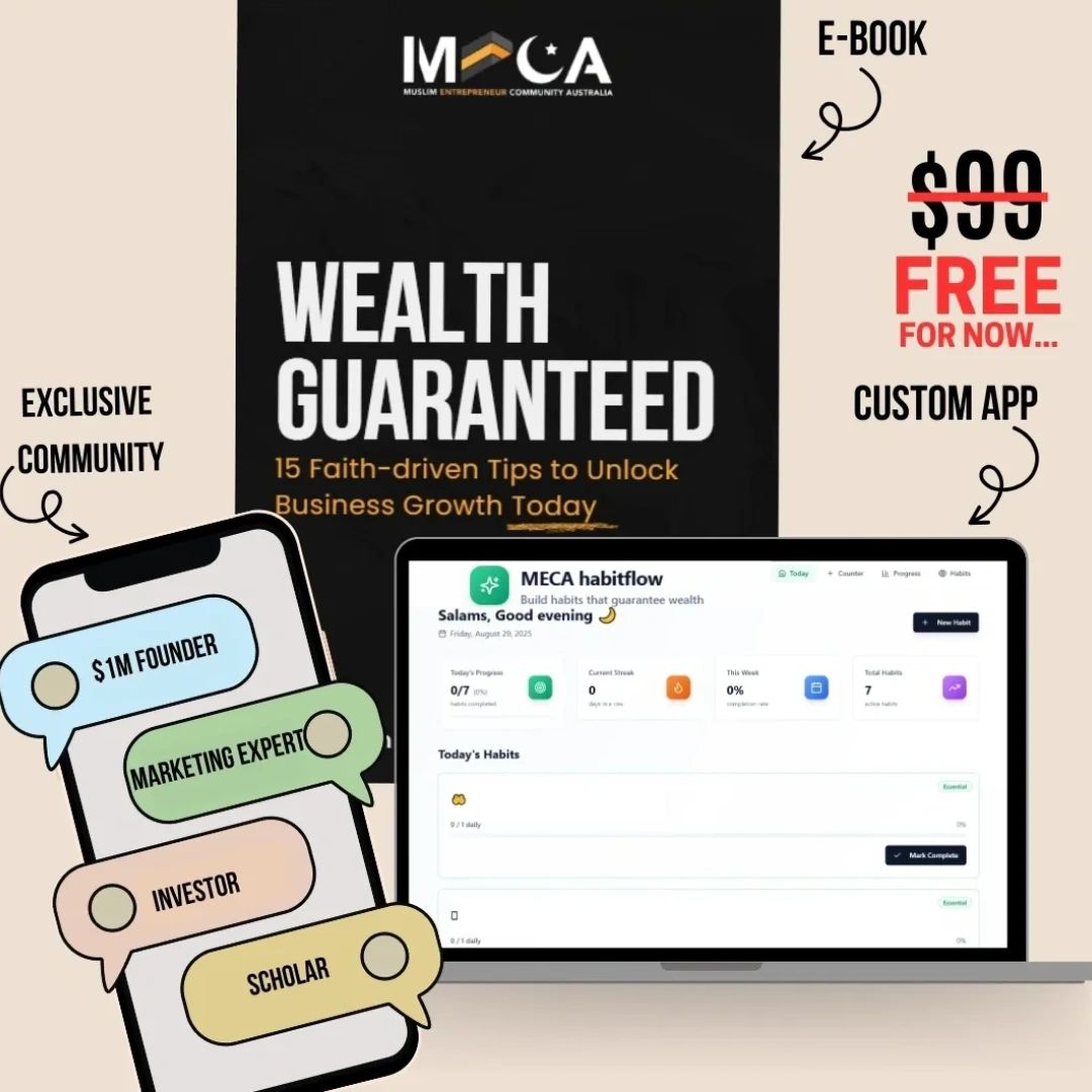 MECA provides education, resources, tools, and community support for Muslim business owners. We do not make any financial guarantees. Your results will depend on your own effort, execution, and circumstances. No promises of income, growth, or success are made. The strategies and resources we share are for guidance. Implementation is your responsibility. “Wealth Guaranteed” is a title based on statements and wisdom derived from Islamic texts. It is not a guarantee from MECA. Your results depend entirely on your own actions, discipline, and execution.